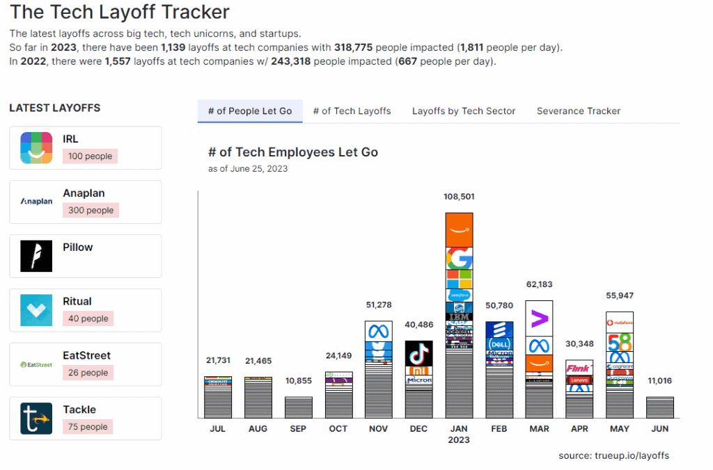 To put the layoffs in perspective, we show a number of well-known companies and the percentage of employees they had laid off. Amazon laid off ‘only’ 1% of its employees, but when looking at Trueup Layoffs Chart, this represented 18,000 individuals.