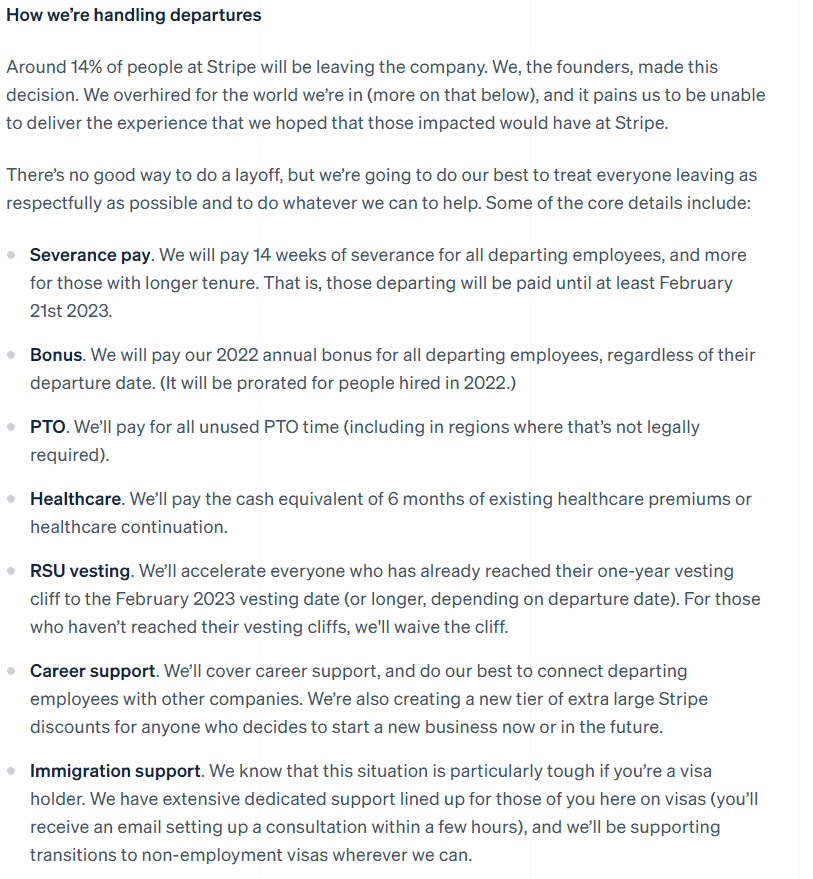 More concretely, they also provided 14 weeks of severance pay, bonuses that were owed, Paid Time Off employees were due, healthcare, career support to connect departing employees with other companies, extra large Stripe discounts for anyone who decides to start a new business now or in the future, and not least important – immigration support.